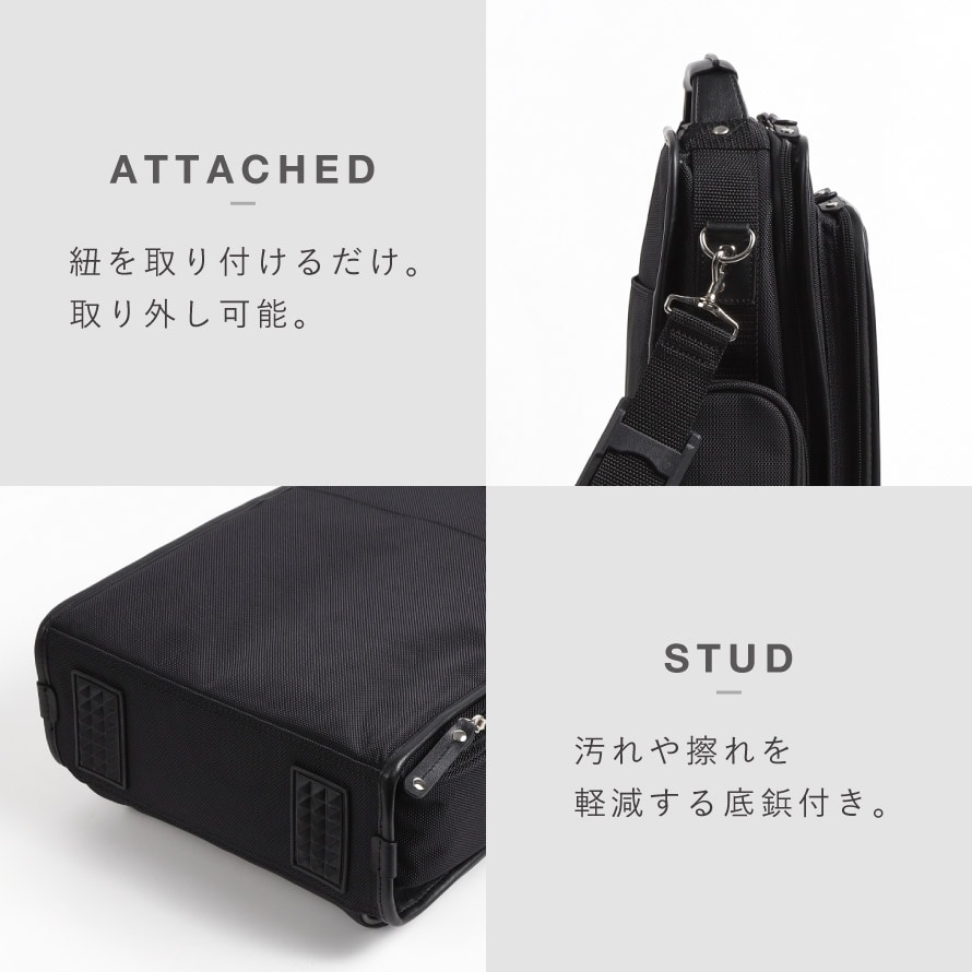 | 備考 | A4サイズ収納可能、底鋲(ゴム足鋲)、着脱式肩アテ付きショルダーベルト、上部取っ手付き |