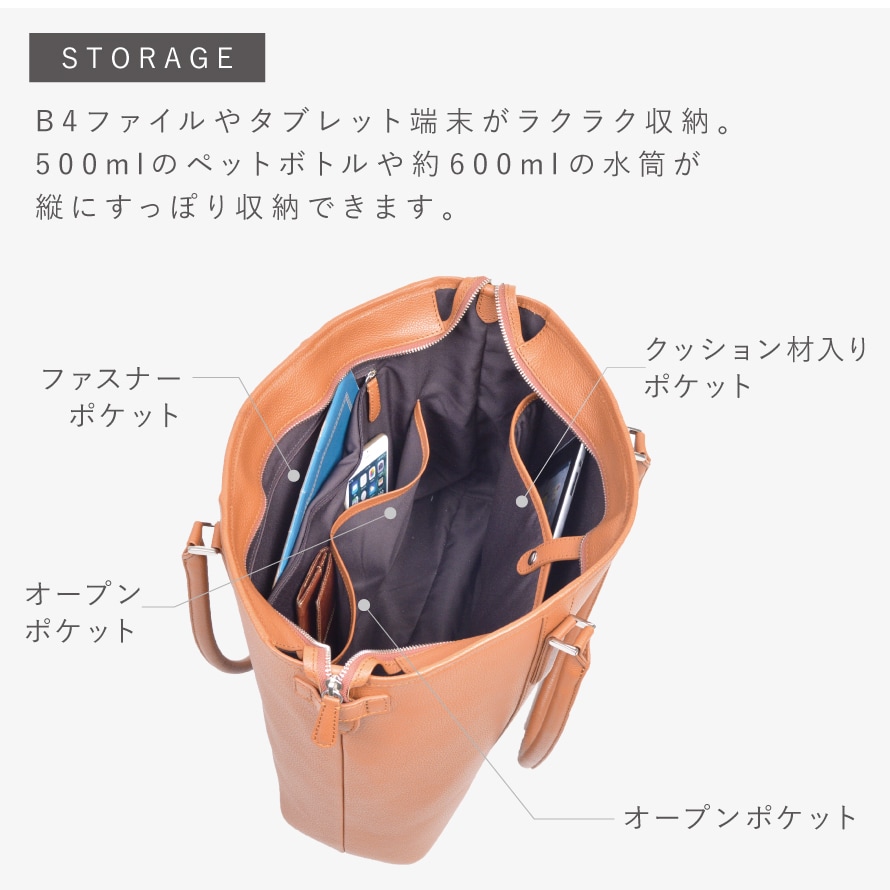 メインルームは安心の天ファスナー式開閉。マチもしっかりありB4ファイル対応の広いメインルーム内には、クッション材入りのポケット付きでノートパソコンやタブレットの収納ができます。