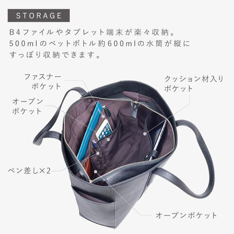メインルームは安心の天ファスナー式開閉。マチもしっかりありA4ファイル対応の広いメインルーム内には、クッション材入りのポケット付きでノートパソコンやタブレットの収納ができます。