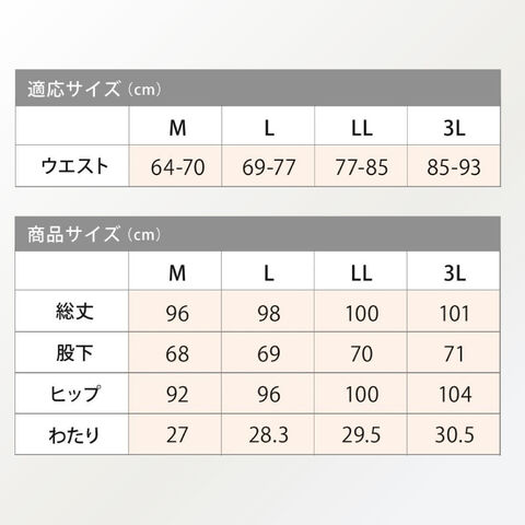 | サイズ | M/ウエスト64-70、股下68、ヒップ92cm、L/ウエスト69-77、股下69、ヒップ96cm、LL/ウエスト77-85、股下70、ヒップ100cm、3L/ウエスト85~93、股下71、ヒップ104cm |