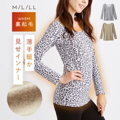 インナー 長袖 レディース 裏起毛 裏起毛インナー 薄手 ストレッチ 冬 暖かい あったか あったかインナー 防寒 肌着 シャツ 裾長 丈長 ロング ロング丈 ラウンドネック ブラウン 茶 グレー レオパード 豹柄 ヒョウ柄 Uネック 深い M L LL 大きいサイズ ゆったり 裏起毛あたた...