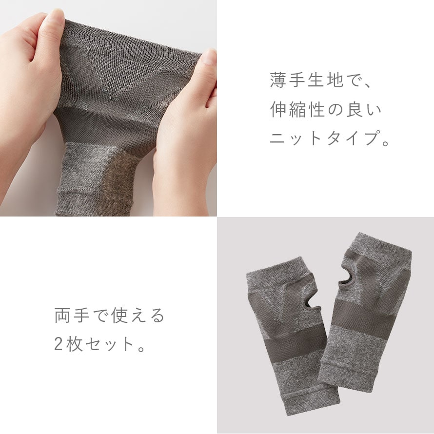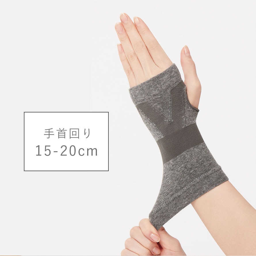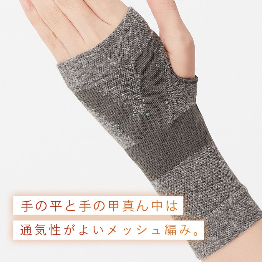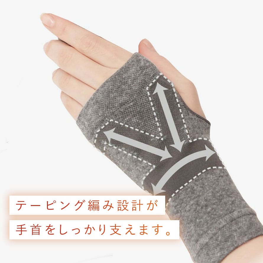 切り替え編みのテーピングラインで手首をしっかりサポート。日常動作で手首が支えられて楽チン!