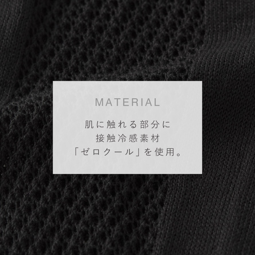 肌に触れる部分はひんやり涼しい接触冷感素材「ゼロクール」を使用。生地の表側にはオーガニックコットンを使用し、汗を吸いやすく柔らかな着け心地です。