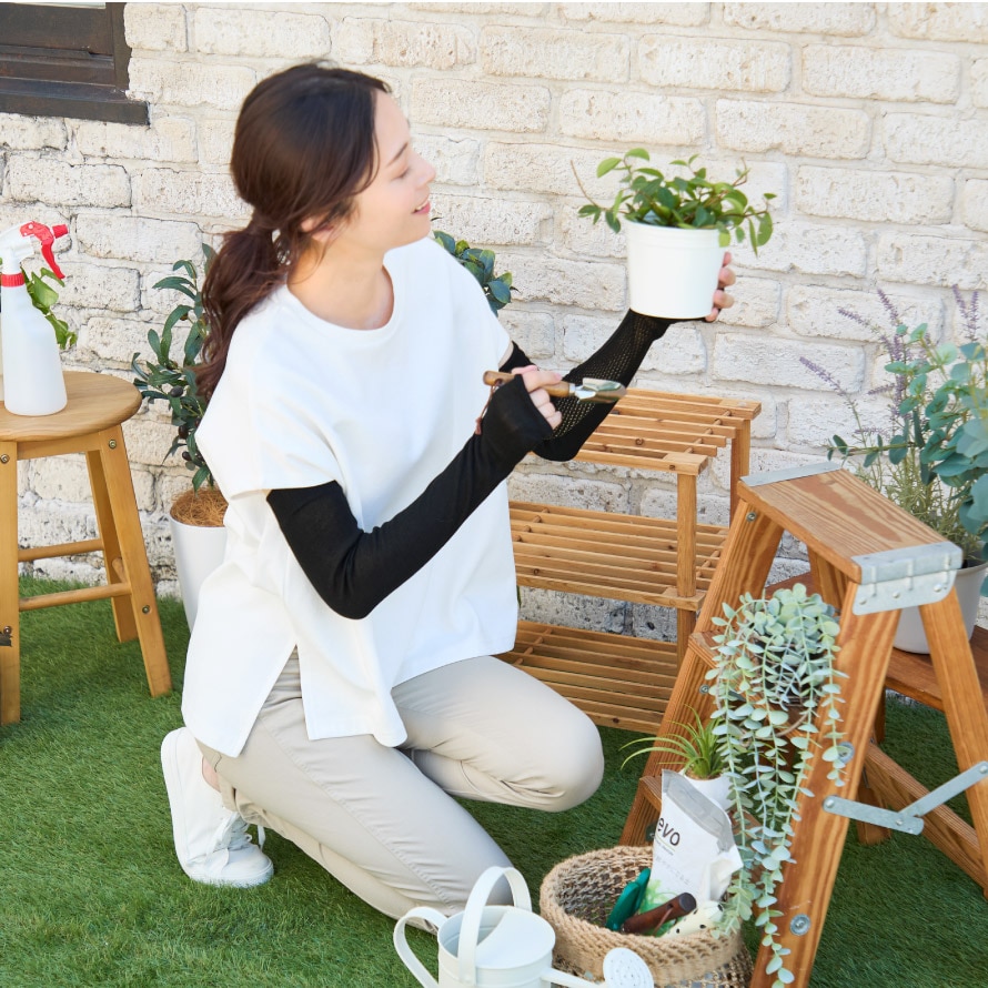 紫外線カット率は98%以上。日がよく当たる外側は無地にしているので、外での作業時にも紫外線からお肌を守ります。
