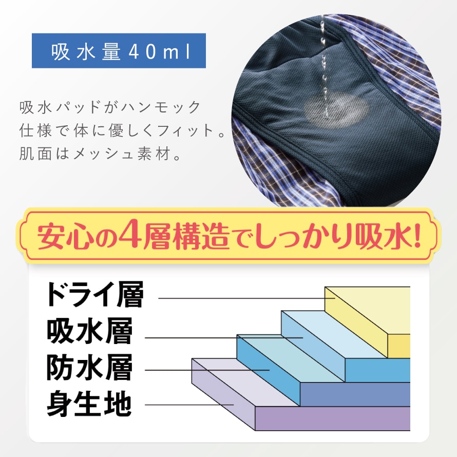 | 材質 | 身生地/綿100%、ドライ層、吸水層、防水層/ポリエステル100% |