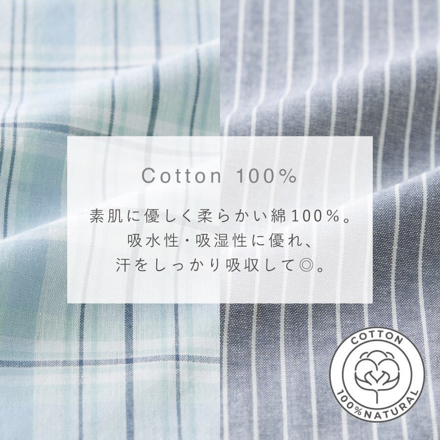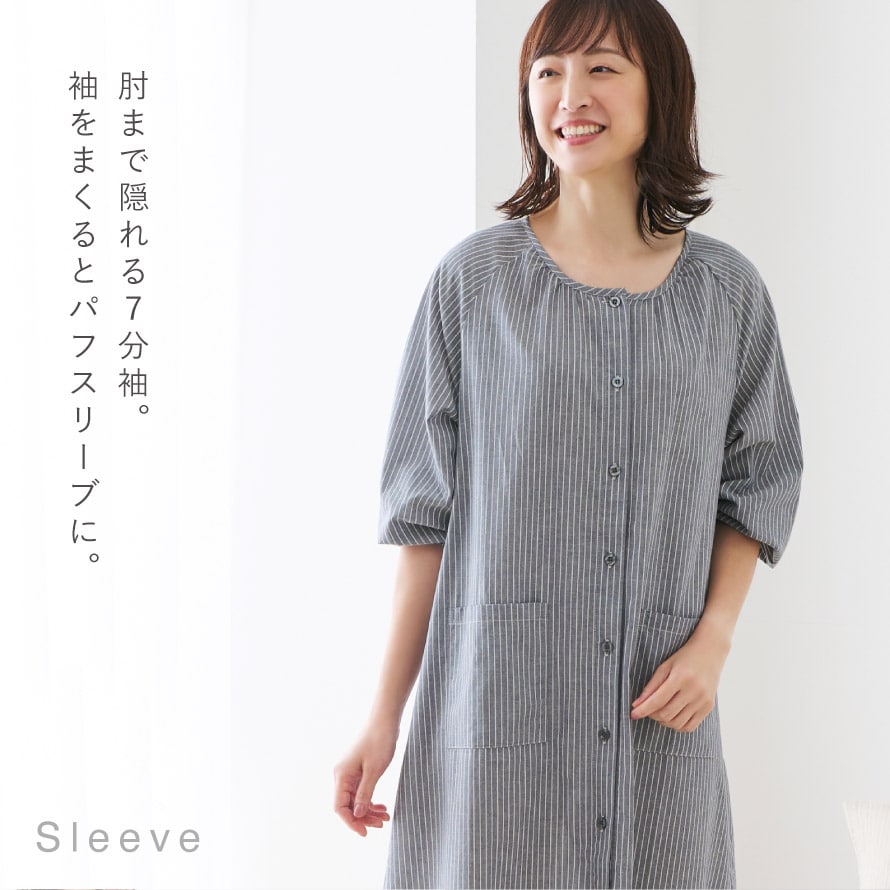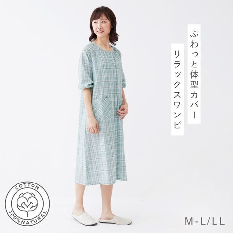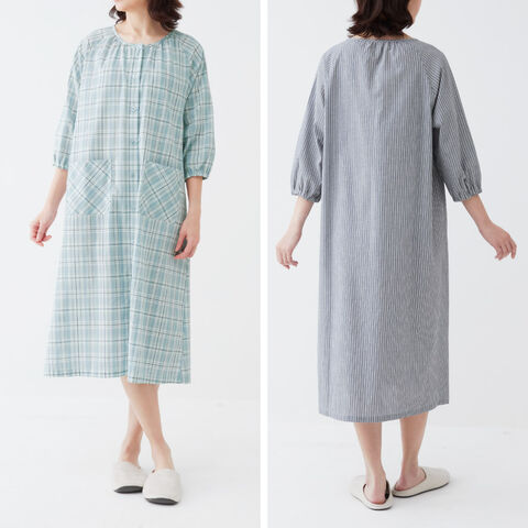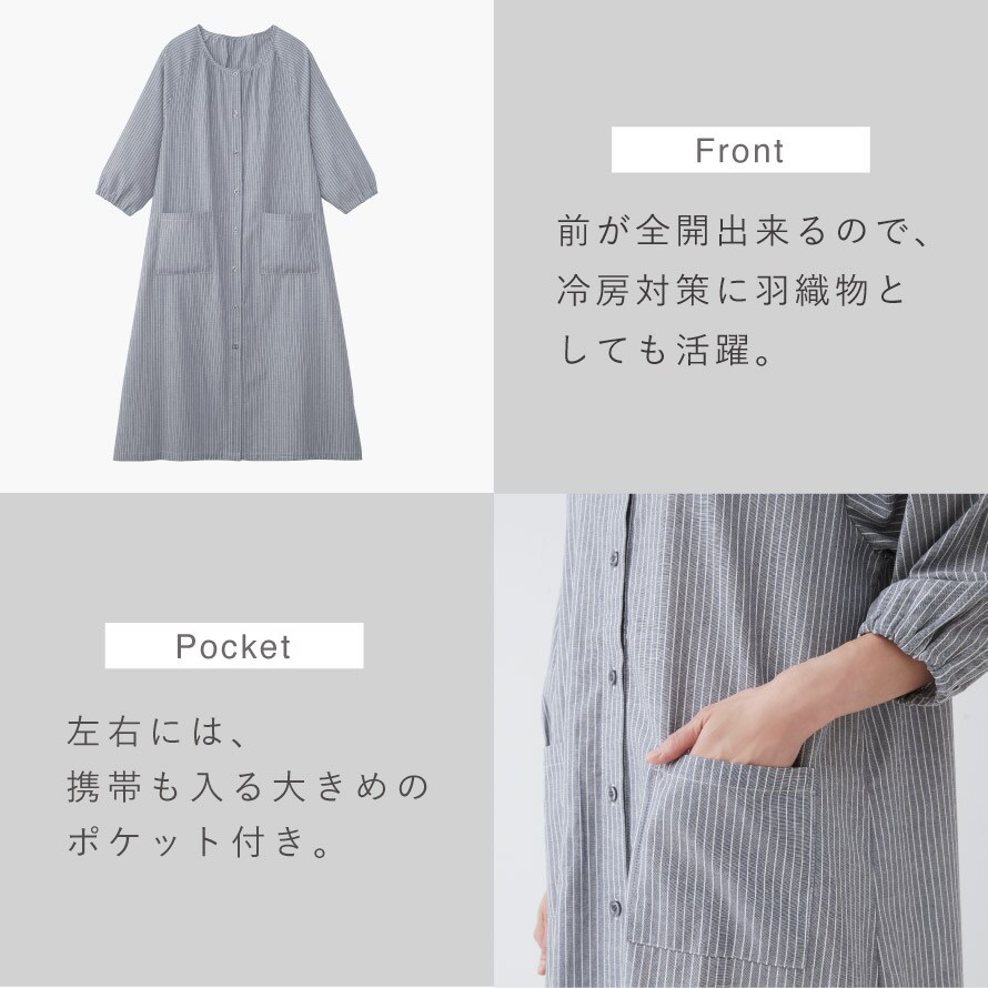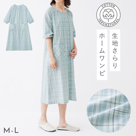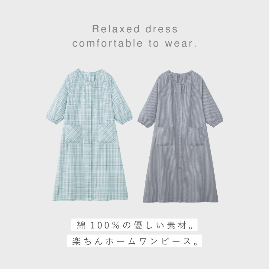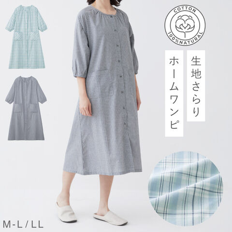素肌に優しく柔らかい綿100%。吸水性・吸湿性に優れ、汗をしっかり吸収するので暑い季節にも◎。平織りなのでさらりとした快適な着心地。お家でのリラックス時間、お風呂上りや就寝時にもおすすめのホームワンピです。