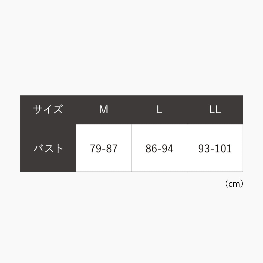| サイズ | バストM/79-87、L/86-94、LL/93-101cm |