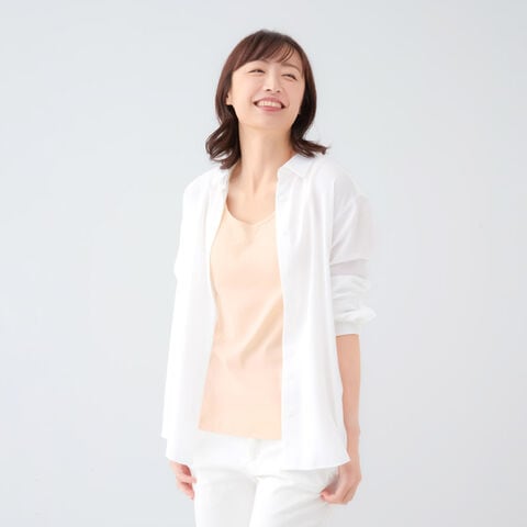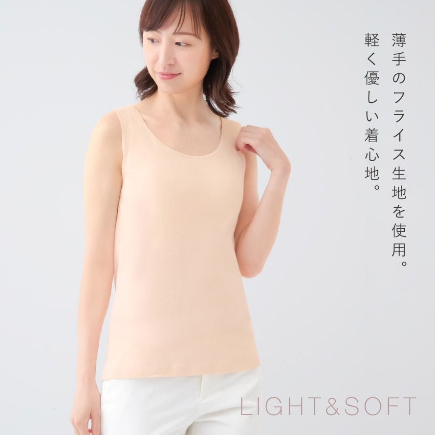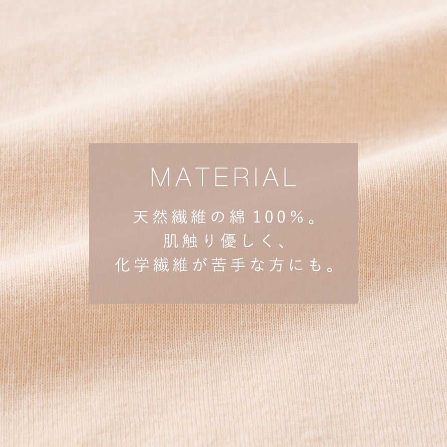 やわらかく優しい肌触りが特徴の綿100%。薄手のフライス生地を使用しているので軽く優しい着用感です。