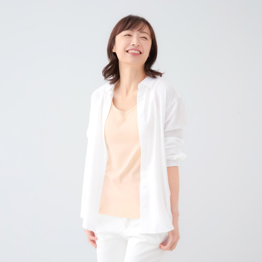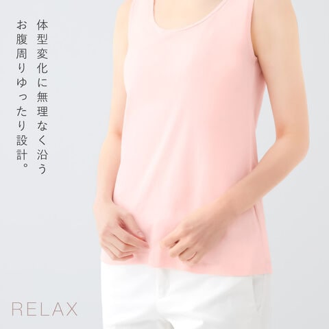 1枚で着られるブラカップ付き。ブラなし着用ができ、窮屈感から解放されたストレスフリーな着心地。体型変化に無理なく沿うお腹周りゆったり設計。