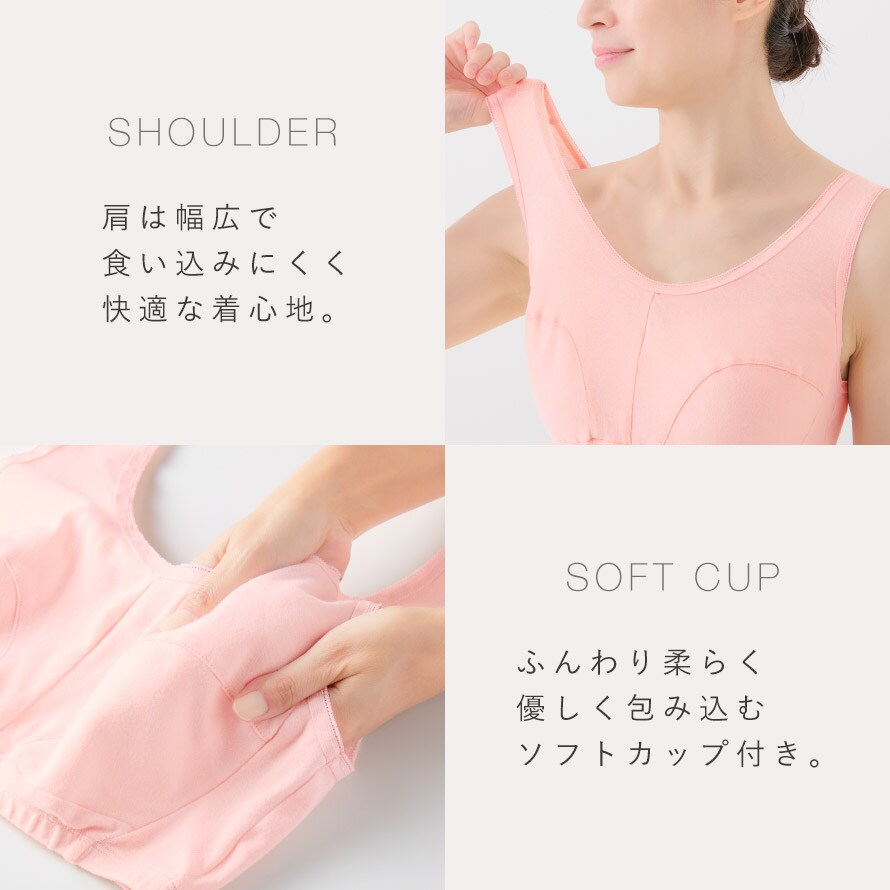 肩に負担がかかりにくい伸縮性のある幅広ストラップ。後ろホックのない被り着型なのでバックスタイルもスッキリ。ふんわり柔らかいソフトカップ付き。