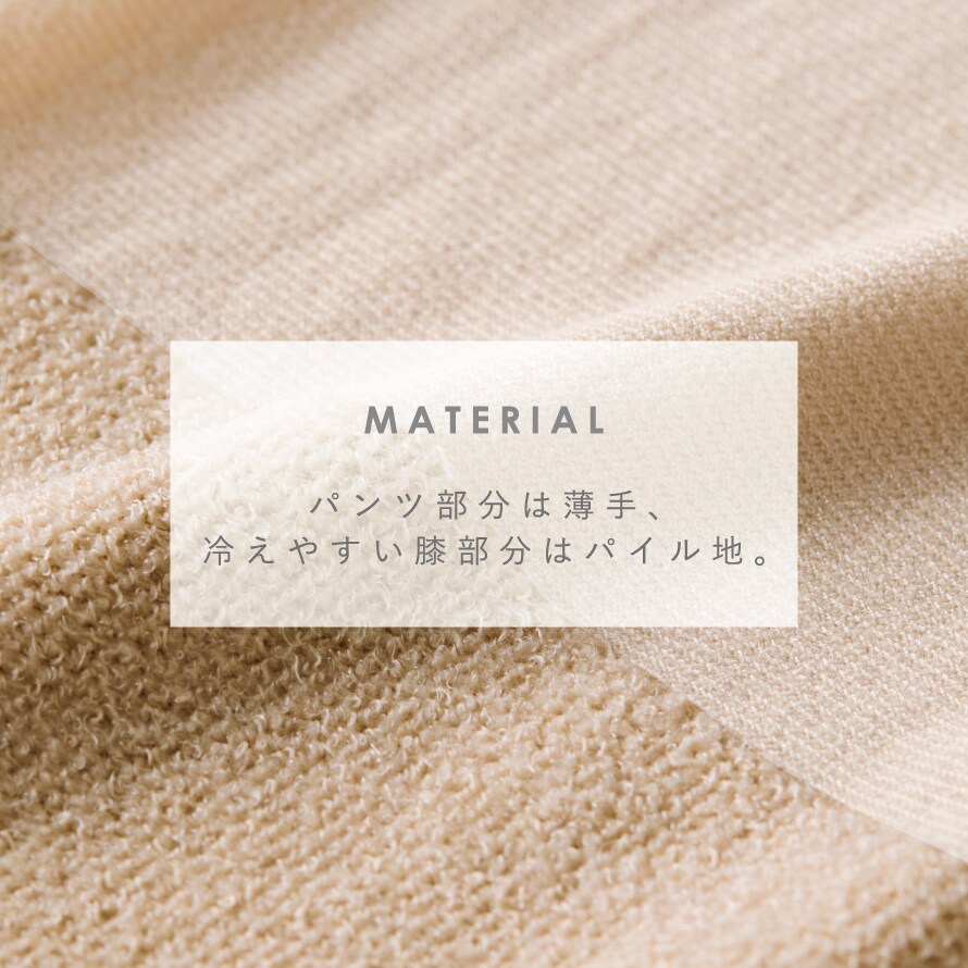 薄手のパンツのひざ部分を裏パイル仕様にすることでふんわり温かいサポーター機能を付けました。