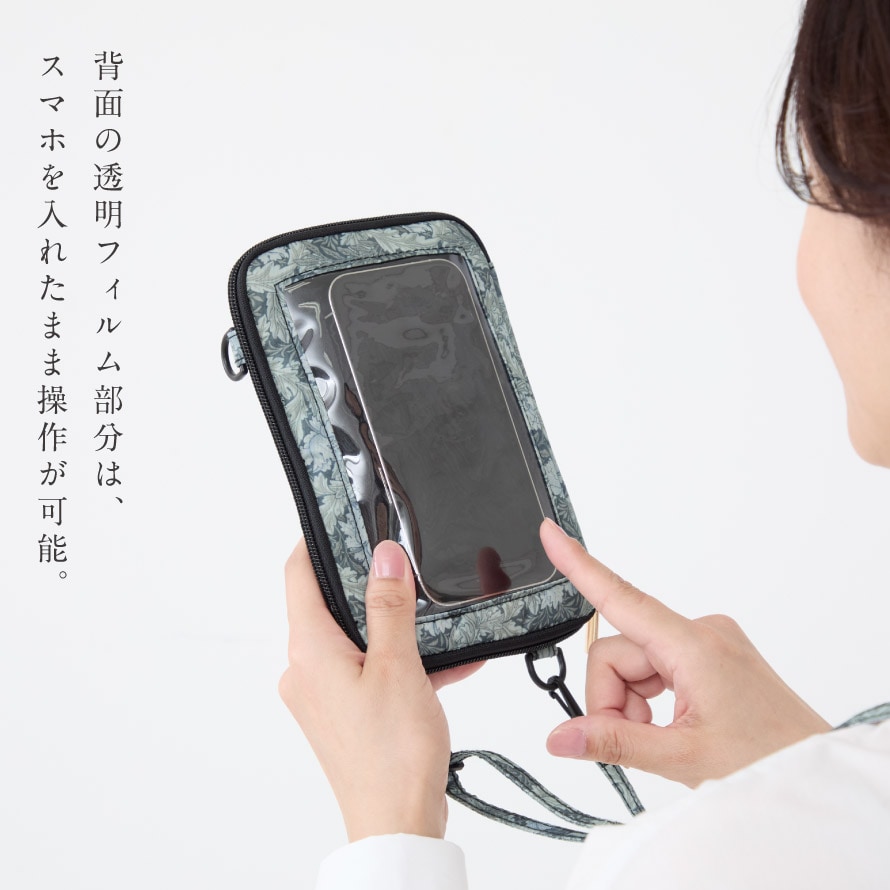 背面の透明フィルム部分は、スマホを入れたまま操作が可能で、お出かけ中にも便利。