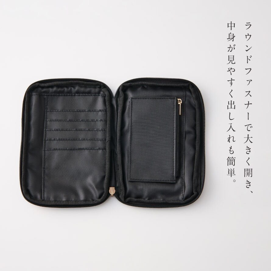 ラウンドファスナー仕様で大きく開き、中身が見やすく出し入れも簡単。