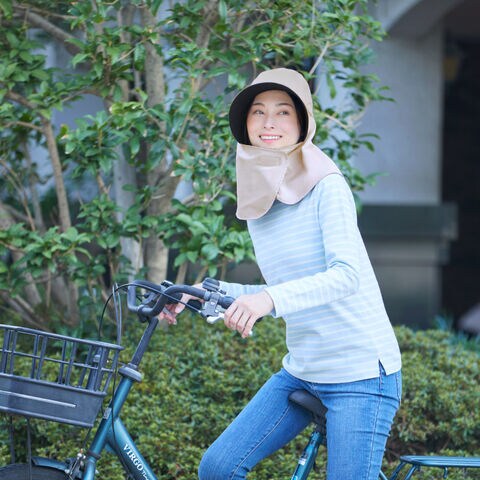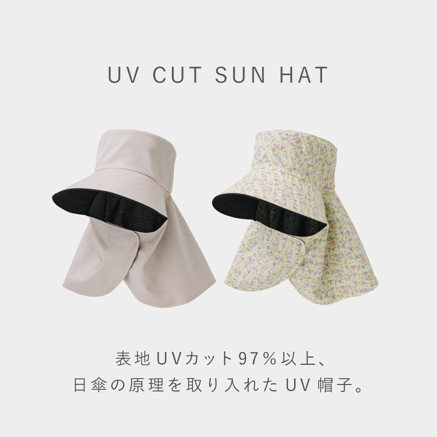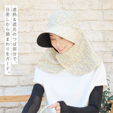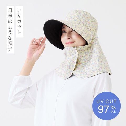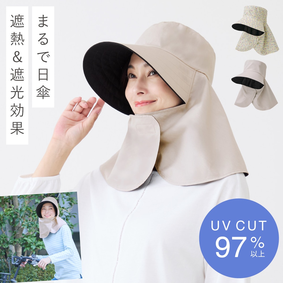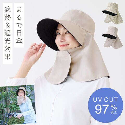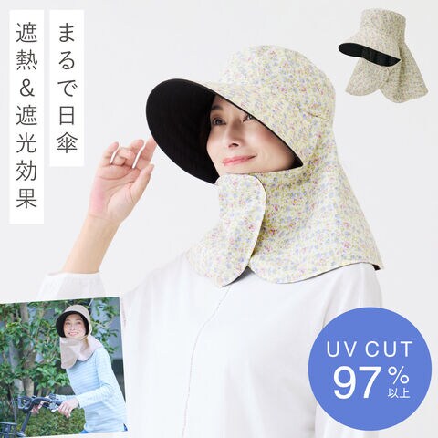 紫外線遮蔽率は約97%以上。遮光&遮蔽性に優れ、紫外線対策と暑さ対策におすすめ。約12cmのつば部分は、下からの照り返しなど、反射光から顔まわりをガード。