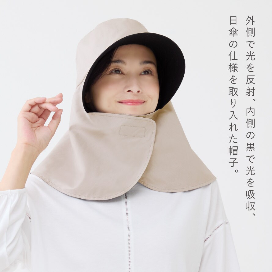 内側が黒、外側を淡色の2色使い。外側で光を反射、内側で光を吸収する、日傘の原理を帽子に取り入れた仕様。