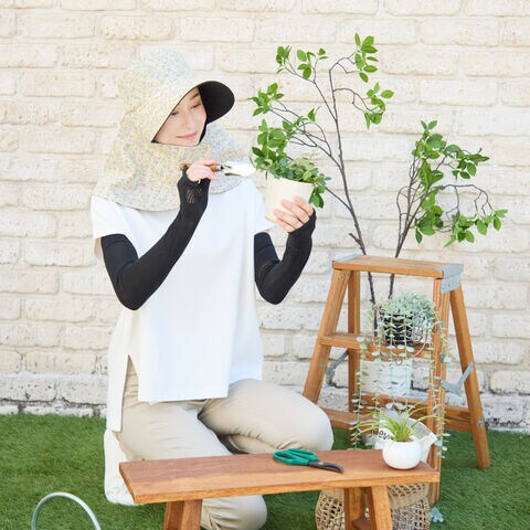 夏のお出かけやガーデニングにもおすすめ。グレージュと花柄の2色からお選びいただけます。