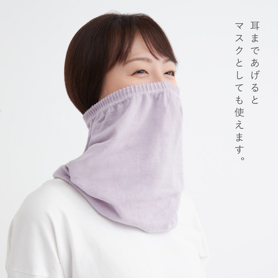 伸縮性があり、かぶるだけの簡単装着。髪型やメイクを崩さず◎。締め付け感がなくゆるやかな着用感です。耳まであげるとマスクとしても使えます。