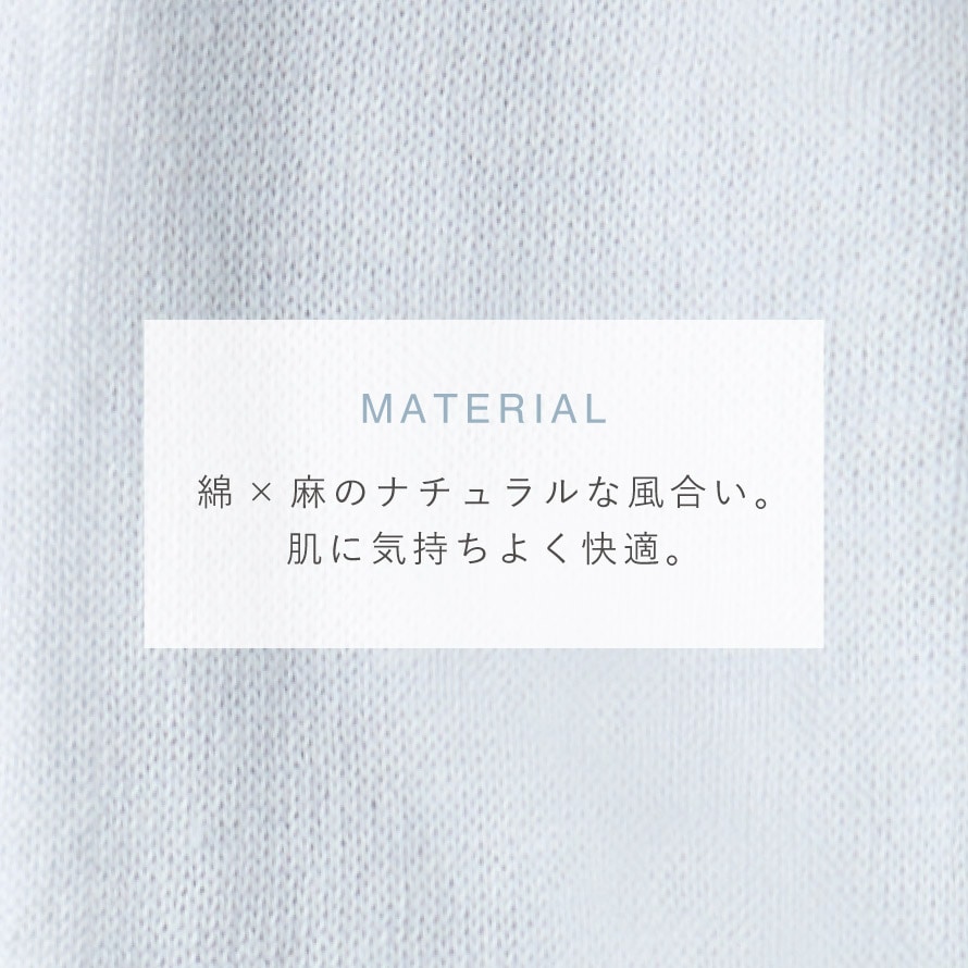 綿×麻の天然素材ならではの、ナチュラルな風合い。肌に気持ちよく快適な着け心地。