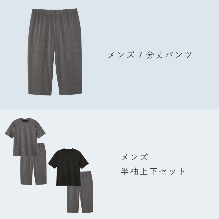 同じシリーズでメンズ七分丈パンツ、半袖シャツと七分丈パンツのセットもございます。