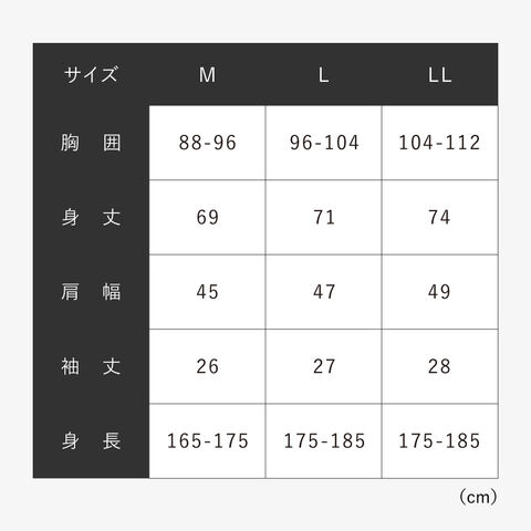 | サイズ | M/身長165-175、胸囲88-96、身丈69、肩幅45、袖丈26、L/身長175-185、胸囲96-104、身丈71、肩幅47、袖丈27、LL/身長175-185、胸囲104-112、身丈74、肩幅49、袖丈28cm |