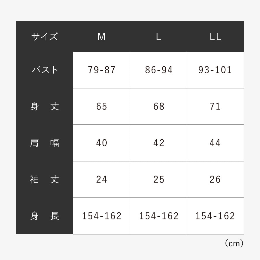 | サイズ | 身長154-162、M/バスト79-87、身丈65、肩幅40、袖丈24、L/バスト86-94、身丈68、肩幅42、袖丈25、LL/バスト93-101、身丈71、肩幅44、袖丈26cm |