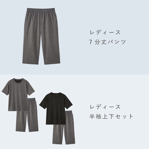 同じシリーズでレディース七分丈パンツ、半袖シャツと七分丈パンツのセットもございます。