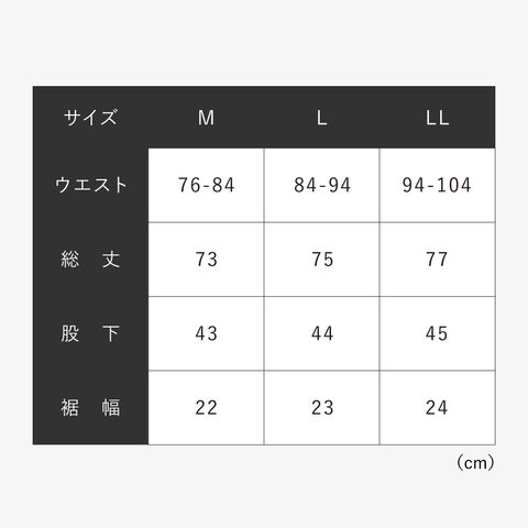 サイズM/ウエスト76-84、総丈73、股下43、裾幅22、L/ウエスト84-94、総丈75、股下44、裾幅23、LL/ウエスト94-104、総丈77、股下45、裾幅24cm