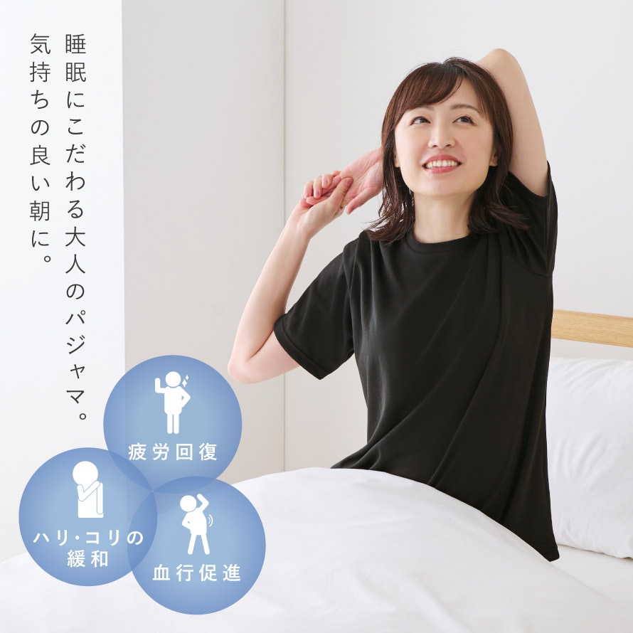 デスクワークや長時間同じ姿勢による肩こりが気になる方、夜ぐっすり眠れず朝にだるさが残る方。夜勤明け、スポーツ後、更年期ケアの方にも。就寝時やおうち時間のリラックスウェアとして最適です。