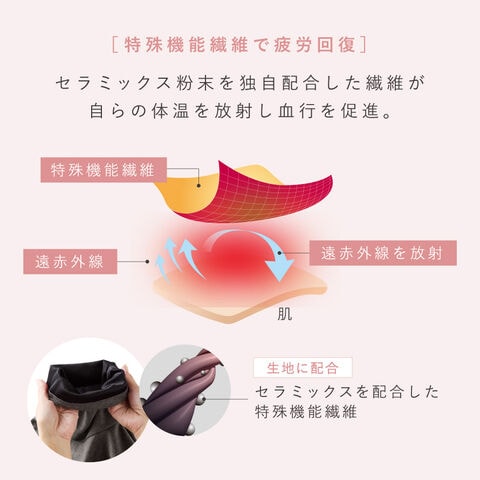 独自配合のセラミックス粉末を練り込んだ特殊繊維が体温を遠赤外線として反射し、血流を改善。肩こり・腰痛・筋肉のコリやハリ・だるさを軽減し、質の良い睡眠と快適な目覚めをサポートします。