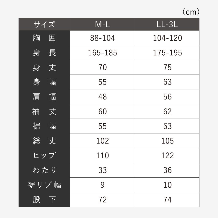 | サイズ | M-L/胸囲88-104、身長165-185、身丈70、身幅55、肩幅48、袖丈60、裾幅55、総丈102、ヒップ110、わたり33、裾リブ幅9、股下72、LL-3L/胸囲104-120、身長175-195、身丈75、身幅63、肩幅56、袖丈62、裾幅63、総丈105、ヒップ122、わたり36、裾リブ幅10、股下74cm |