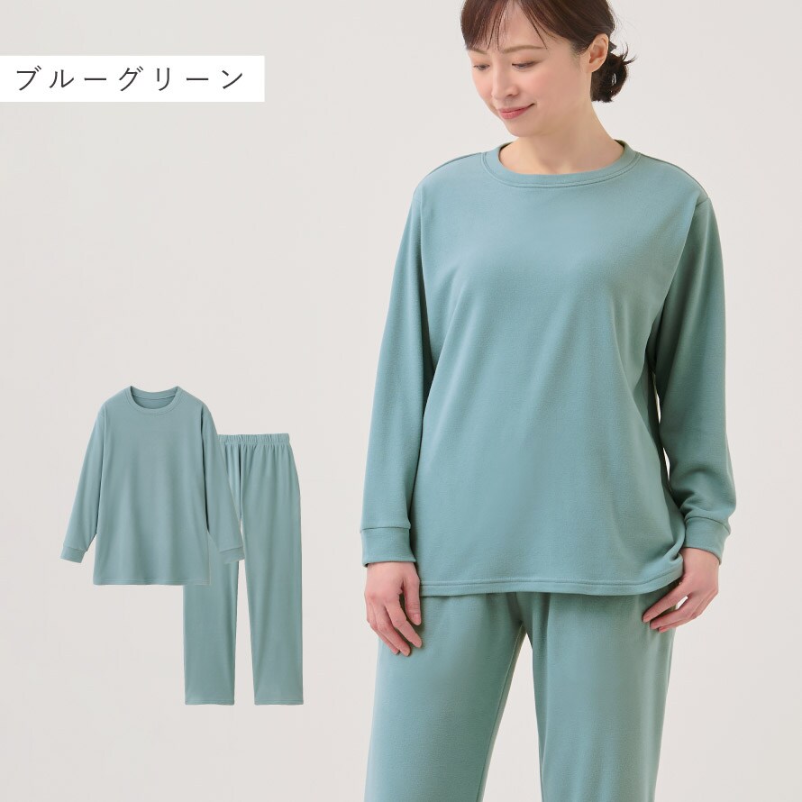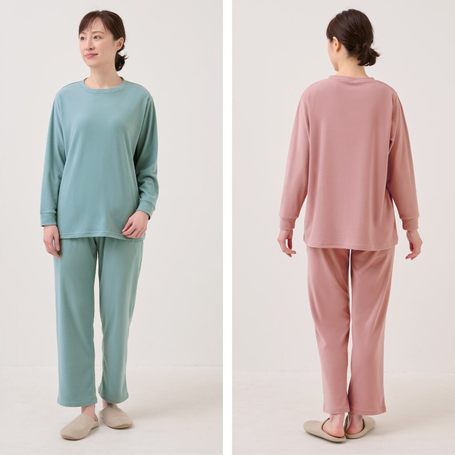 カラーは、やさしく落ち着いた印象のブルーグリーンと、気分がふわっと華やぐピンクの2色展開です。サイズは、M-L、LL-3Lからお選びいただけます。
