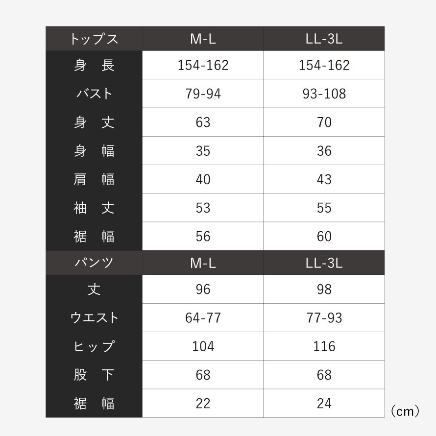 | サイズ | M-L/身長154-162、バスト79-94、身丈63、身幅35、肩幅40、袖丈53、裾幅56、パンツ丈96、ウエスト64-77、ヒップ104、股下68、パンツ裾幅22、LL-3L/身長154-162、バスト93-108、身丈70、身幅36、肩幅43、袖丈55、裾幅60、パンツ丈98、ウエスト77-93、ヒップ116、股下68、パンツ裾幅24cm |