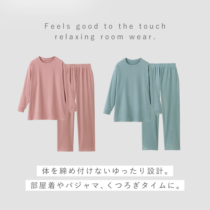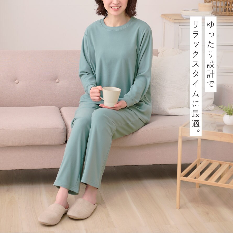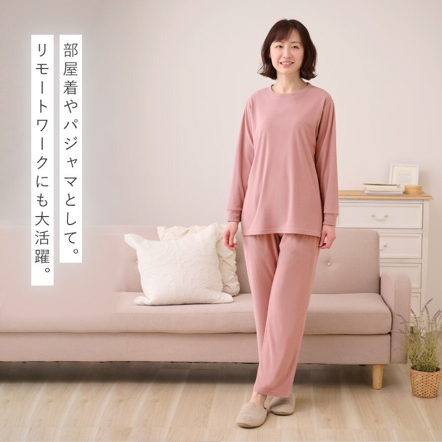 トップスもボトムスも体を締め付けないリラックス設計。長時間の着用でもストレスを感じにくく、家事やリラックスタイム、急な宅配対応までスマートにこなせます。