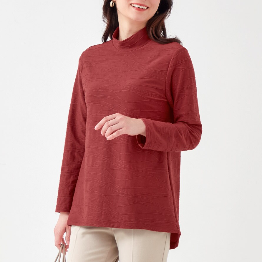 ほんのり高さのあるハイネックは、気になる首まわりをやさしく包み込んでカバー。顔まわりを引き締めて見せてくれる効果もあり、上品な印象をプラス。