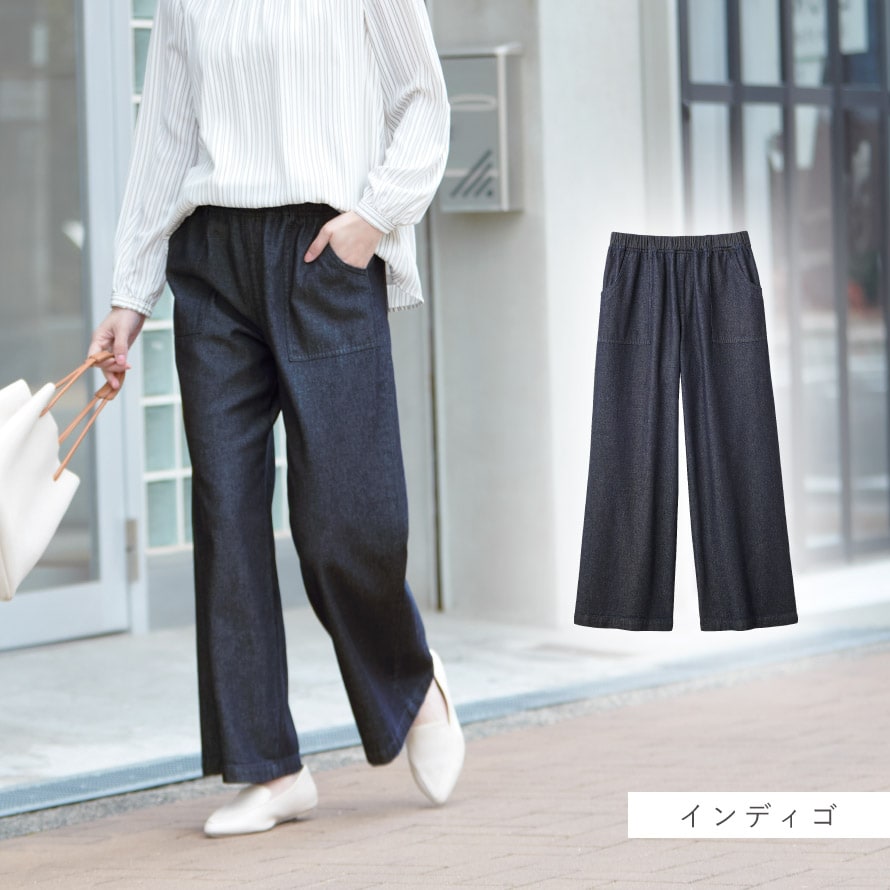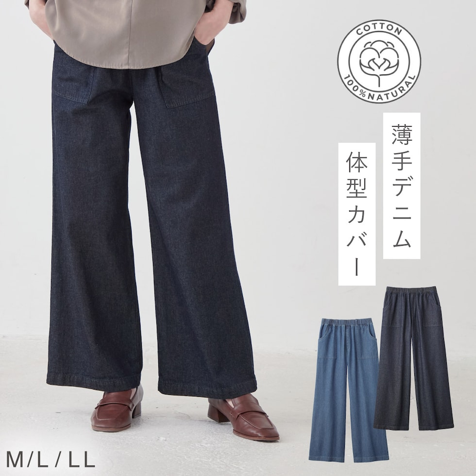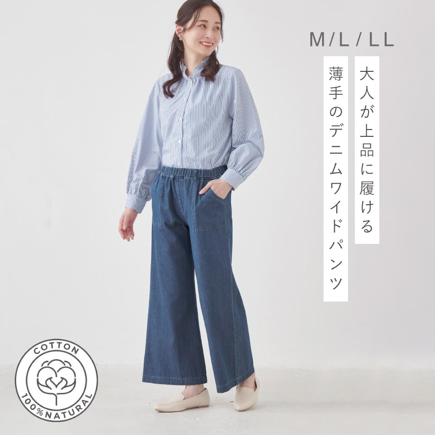 ワイドパンツ デニム レディース 綿100% きれいめ デニム ワイド ウエストゴム パンツ 春 夏 デニムワイドパンツ M L LL 大きいサイズ ゆったり 40代 50代 60代 ミセス 婦人 ミセスファッション