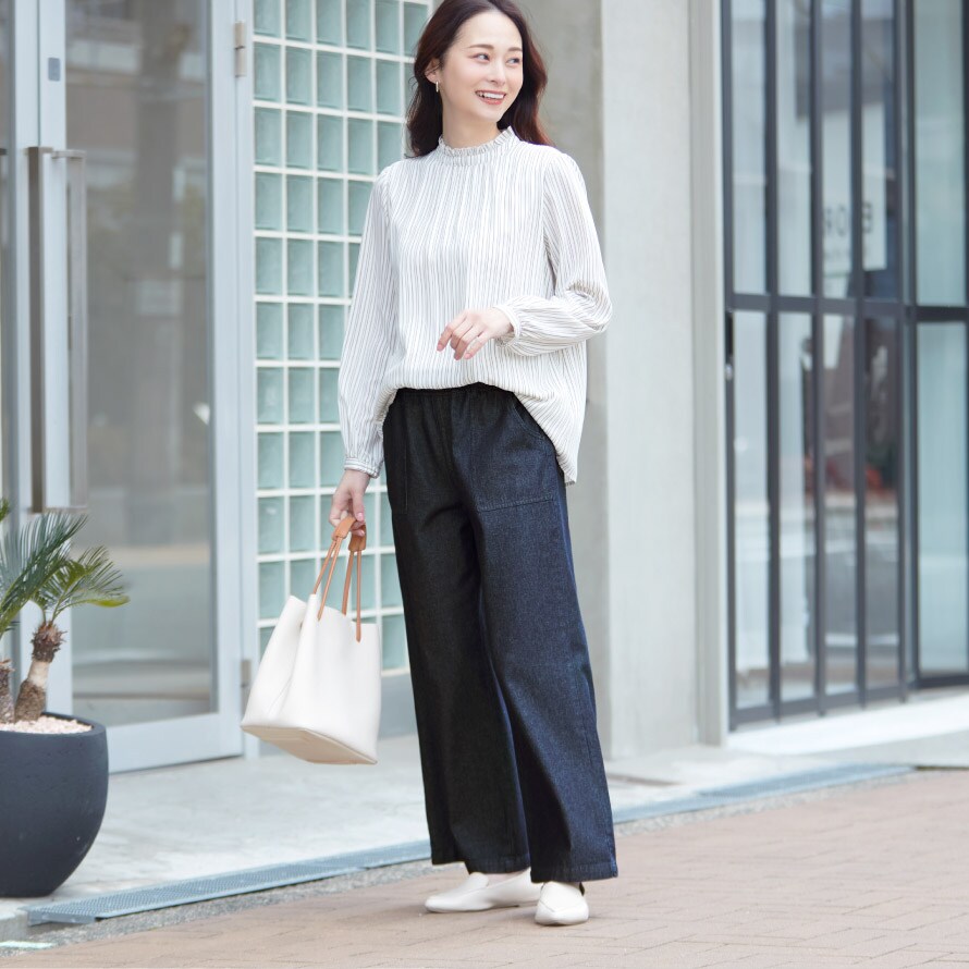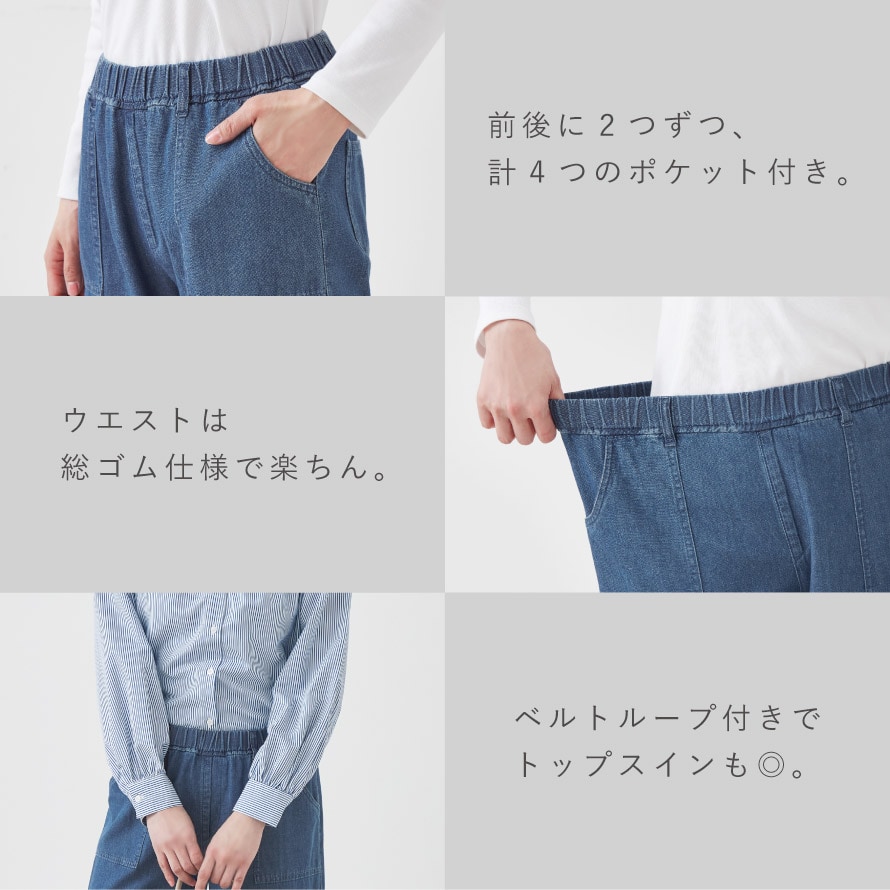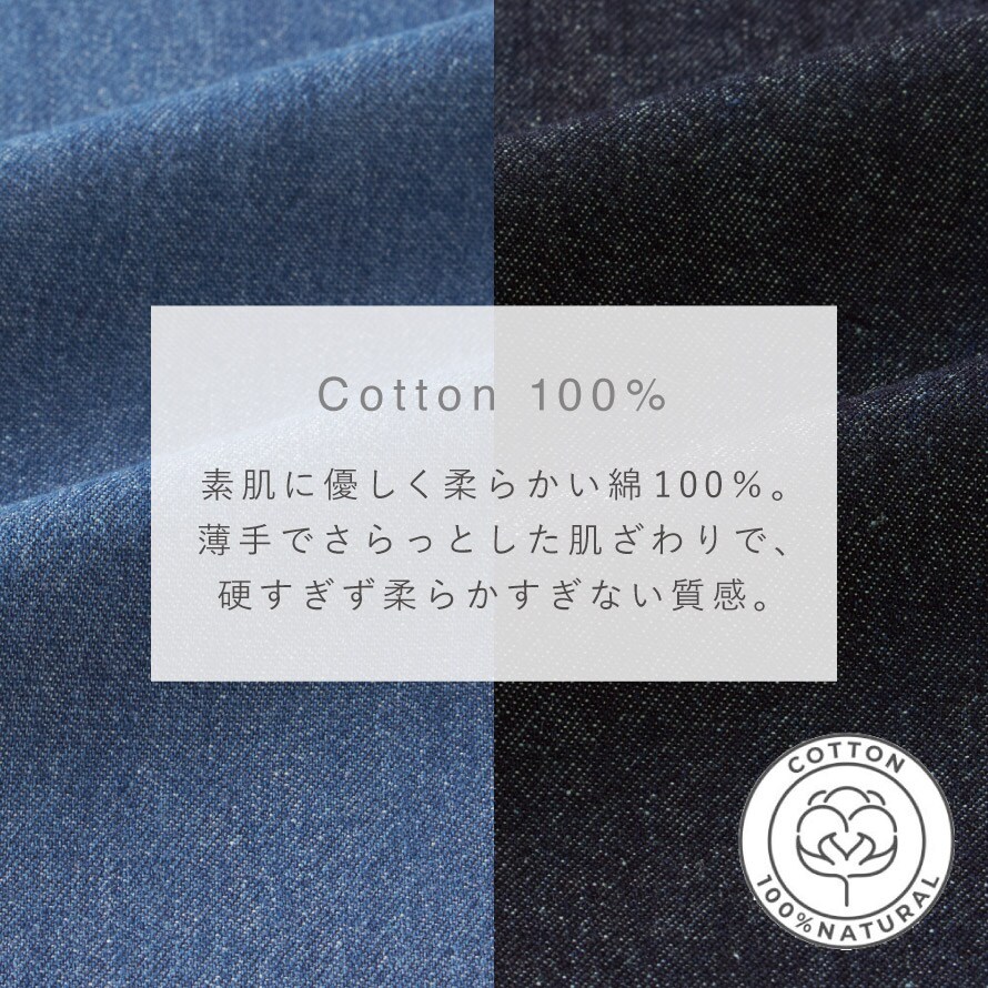 少し薄手の綿100%デニム生地を使用。ナチュラルでさらっとした肌ざわりで、硬すぎず柔らかすぎない絶妙な質感。一日中ストレスフリーな履き心地です。デニムでもカジュアルになりすぎず、大人の上品さを演出できます。