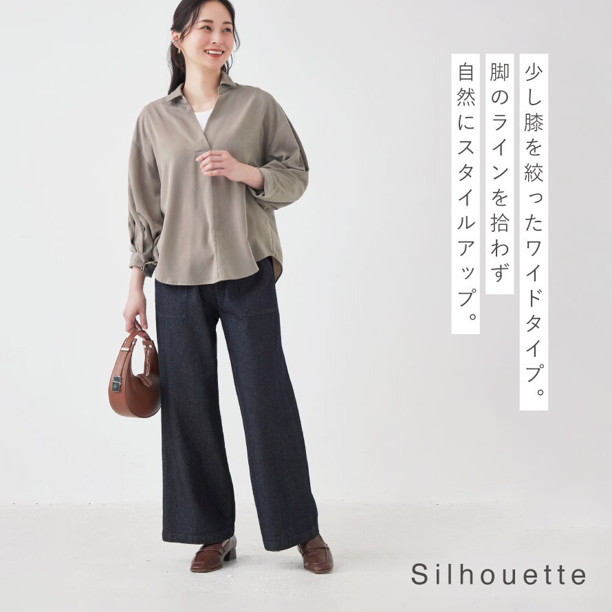 ほんのり膝を絞ったワイドシルエット。広がりすぎず適度なボリューム感は、脚のラインを拾わず、自然にすらっと見えに。計算されたシルエットで、パンツスタイルを美しく見せてくれます。