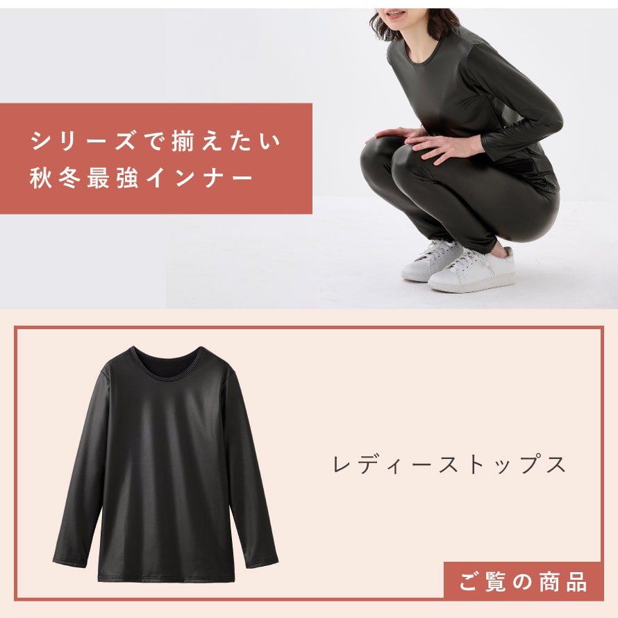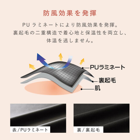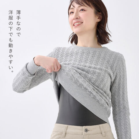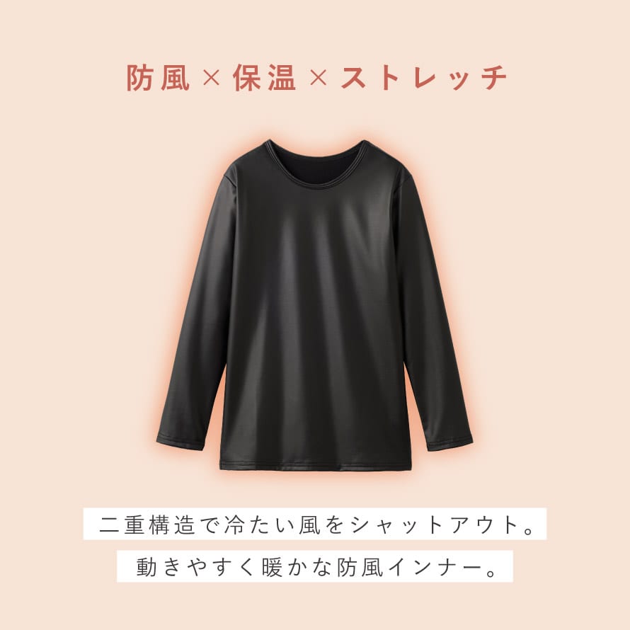 薄手のストレッチ素材で動きやすく、風を通さないだけでなく、内側までしっかり暖かい。洋服の下に着る、レディース防寒インナーです。
