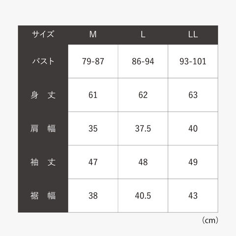 | サイズ | M/身丈61、肩幅35、袖丈47、裾幅38、L/身丈62、肩幅37.5、袖丈48、裾幅40.5、LL/身丈63、肩幅40、袖丈49、裾幅43cm |