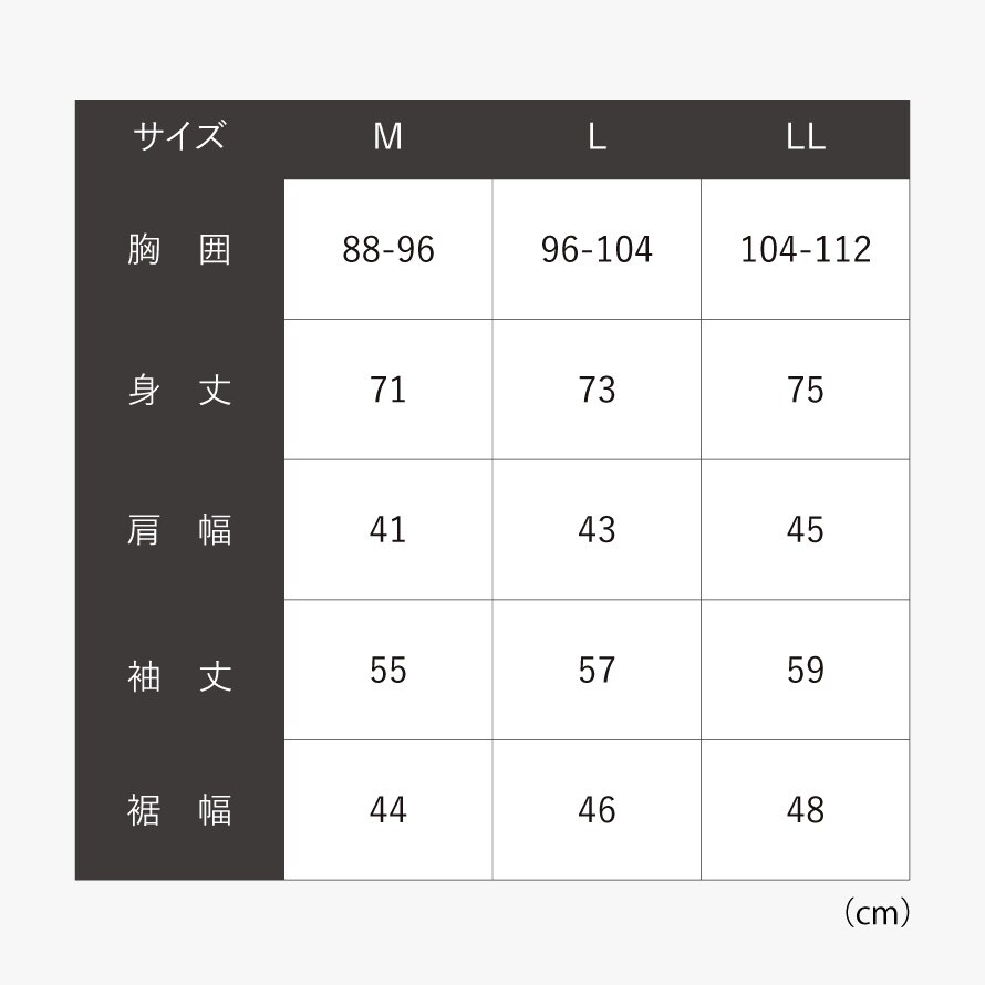 | サイズ | M/身丈71、肩幅41、袖丈55、裾幅44、L/身丈73、肩幅43、袖丈57、裾幅46、LL/身丈75、肩幅45、袖丈59、裾幅48cm |
