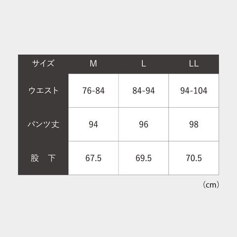 | サイズ | M/ヒップ76-84、パンツ丈94、股下67.5、L/ヒップ84-94、パンツ丈96、股下69.5、LL/ヒップ94-104、パンツ丈98、股下70.5cm |