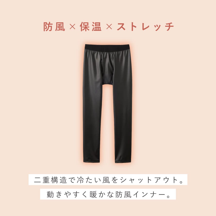 薄手のストレッチ素材で動きやすく、風を通さないだけでなく、内側までしっかり暖かい。洋服の下に着るメンズ防寒パンツです。