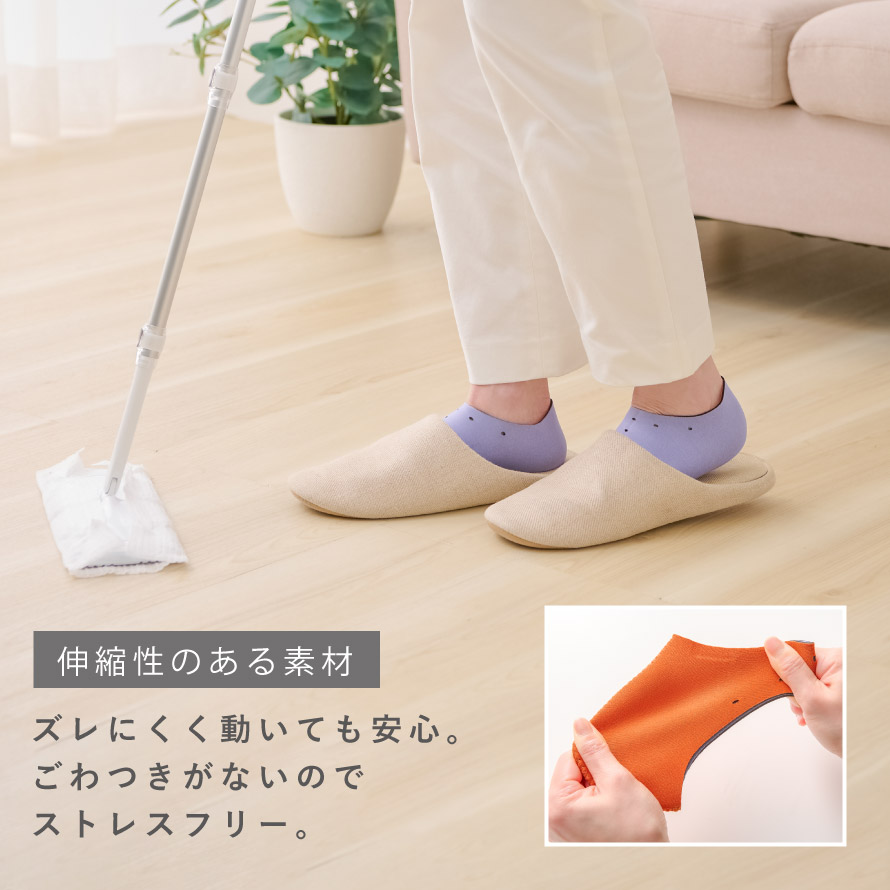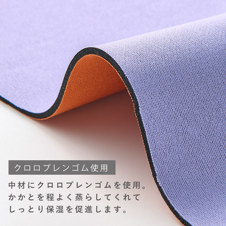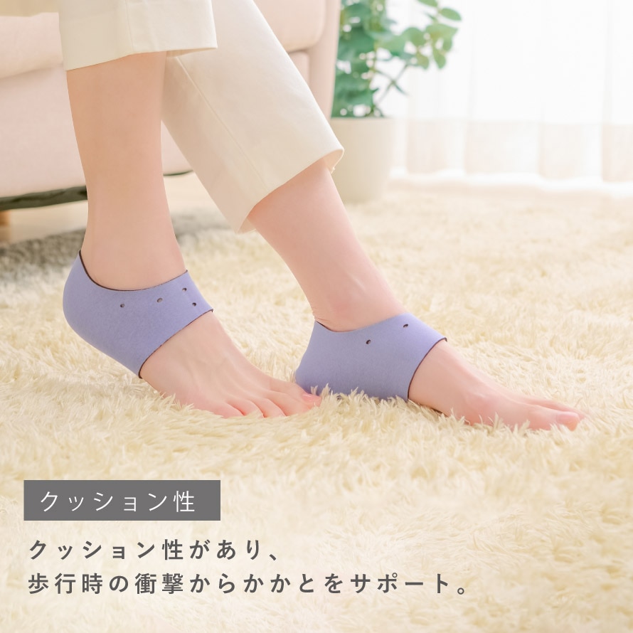 クロロプレンゴムを使用し、かかとを程よく保湿。自然な蒸れ感でしっとり保湿を促進します。また、クッション性があるので、歩行時の衝撃からもかかとをサポートしてくれます。
