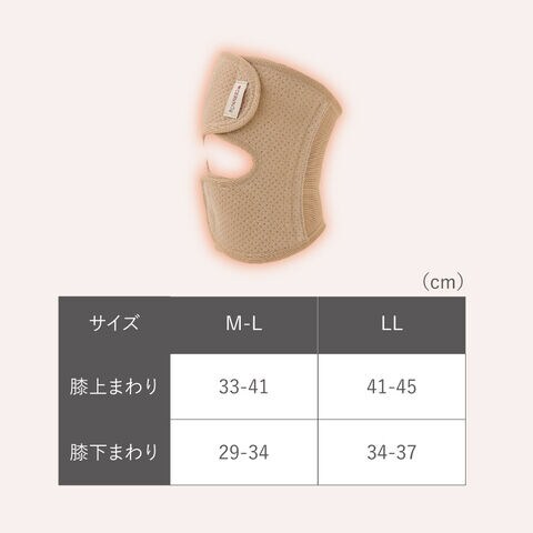 | サイズ | M-L/ひざ上回り33-41、ひざ下回り29-34、LL/ひざ上回り41-45、ひざ下回り34-37cm |