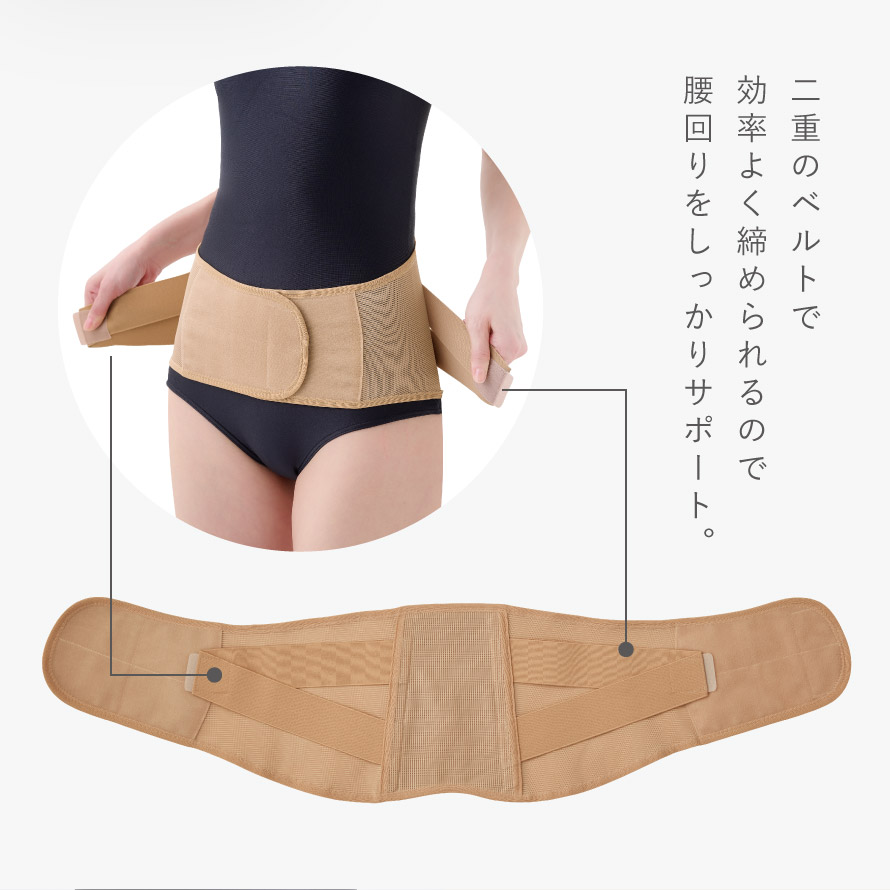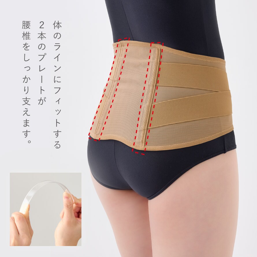 二重のベルトで効率よく締められるので腰回りをしっかりサポート。体のラインにフィットする2本のプレートが腰椎をしっかり支えてくれるので安定感があります。