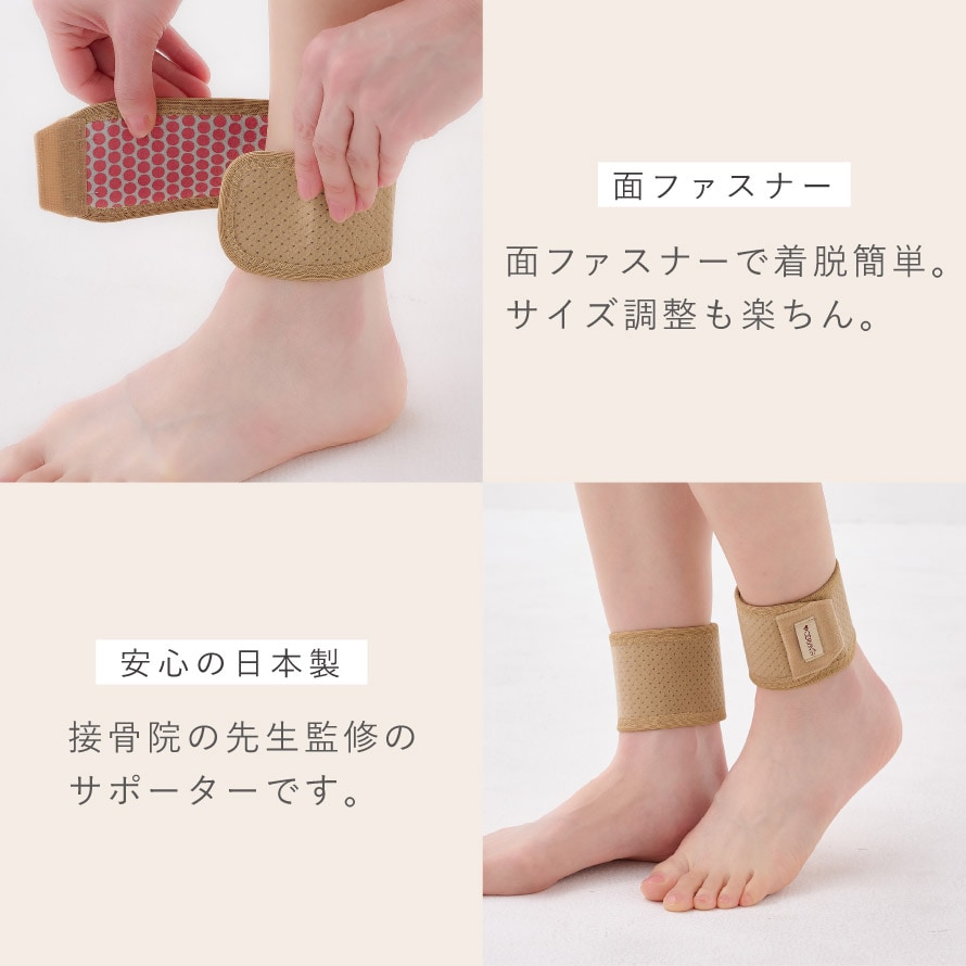面ファスナー式で着脱簡単。サイズ調整も楽ちんで手軽に脱ぎ履きできます。足首にぴったりフィットしながら締めつけ感が少なく、長時間の使用でも快適です。