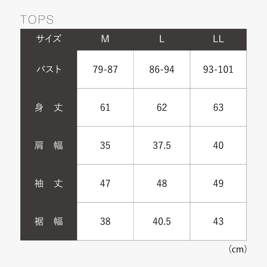 | サイズ | M/身丈61、肩幅35、袖丈47、裾幅38、ヒップ87-95、パンツ丈92.5、股下72、L/身丈62、肩幅37.5、袖丈48、裾幅40.5、ヒップ92-100、パンツ丈94.5、股下73、LL/身丈63、肩幅40、袖丈49、裾幅43、ヒップ97-105、パンツ丈96.5、股下74cm |