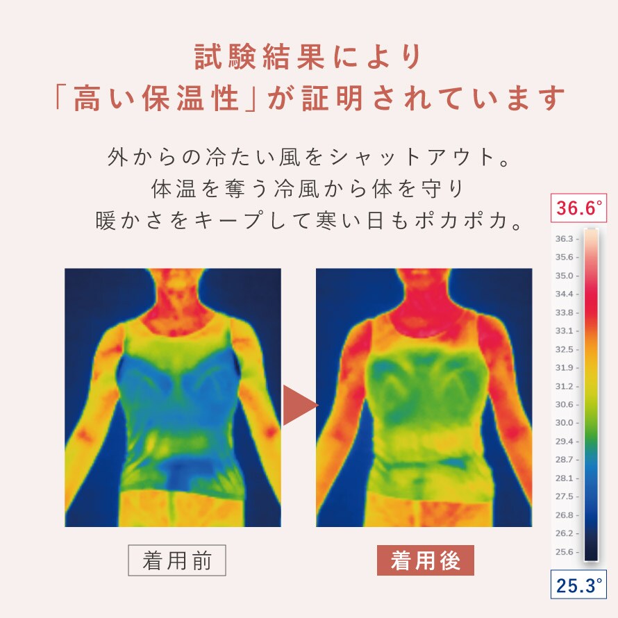 PUラミネートによる「防風効果」と「裏起毛素材」による高い保温性を両立した二重構造で体温を逃しません。着用後の試験結果(メーカー調べ)からも保温効果は証明されています。