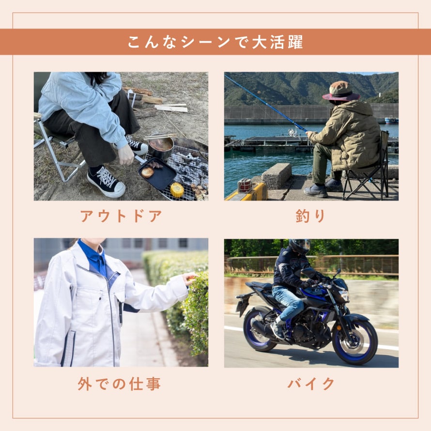 ウィンタースポーツなど、汗をかくシーンには不向きですが、冷たい風を遮りながら暖かくしたい、バイク通勤、自転車通学、外での作業、キャンプ、釣り、スポーツ観戦、冬ゴルフなどのシーンにおすすめします。また、冷え性の方にも最適です。