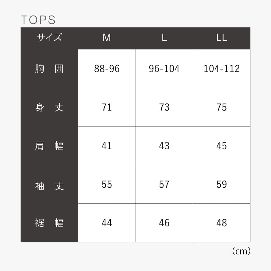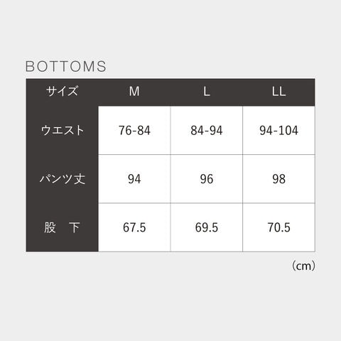 | サイズ | M/身丈71、肩幅41、袖丈55、裾幅44、ヒップ76-84、パンツ丈94、股下67.5、L/身丈73、肩幅43、袖丈57、裾幅46、ヒップ84-94、パンツ丈96、股下69.5、LL/身丈75、肩幅45、袖丈59、裾幅48、ヒップ94-104、パンツ丈98、股下70.5cm |